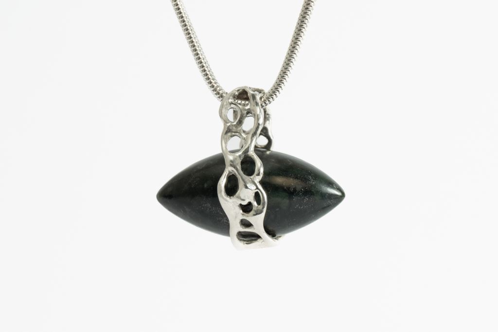 我的作品靈感來自貝殼與大海,承載著對家鄉的思念。石頭因海浪翻滾聲響是故鄉的聲音,提醒著家族的記憶與羈絆。選用家鄉的墨玉製作手環,沉穩質地如同深邃的海,讓人安心。手環的造型源自貝殼的黃金比例,象徵族人與大海的聯繫。我將思念藏於貝殼形象中,讓作品成為可攜的聲音容器,隨時傳遞海浪滾動石頭的回音,彷彿回到故鄉。
