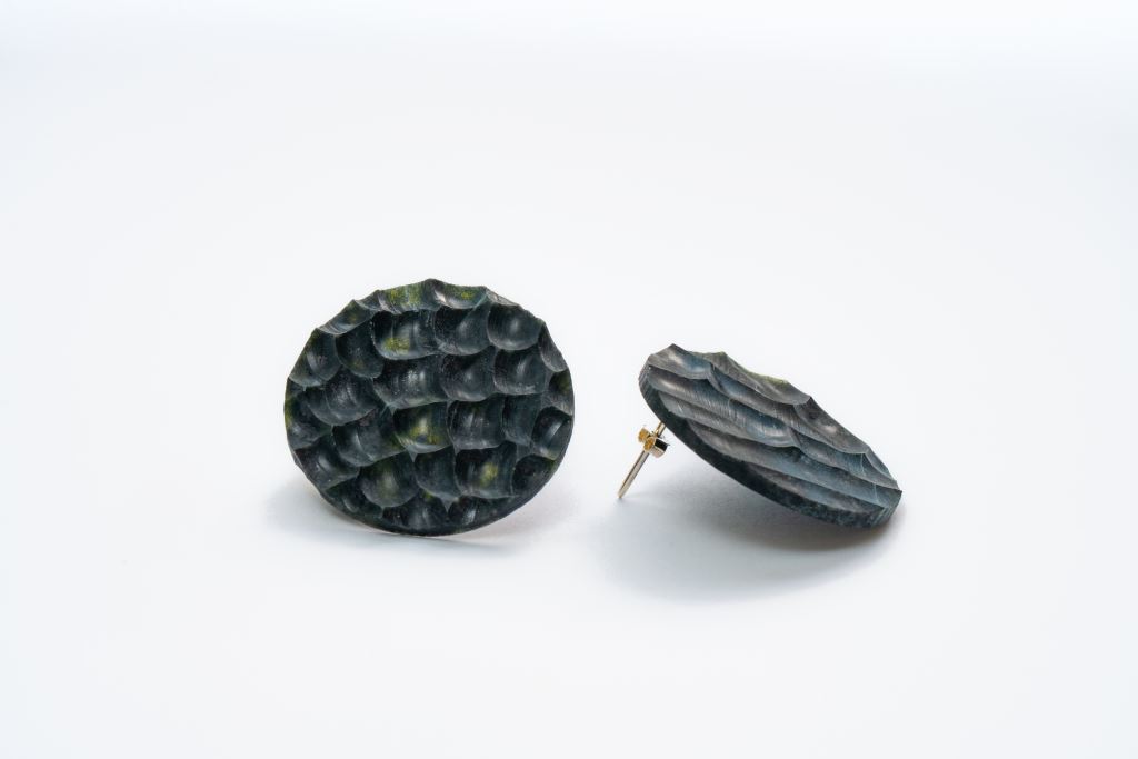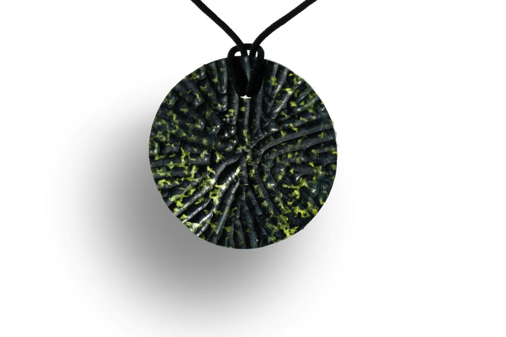 本創作以數位仿生的角度,探索 Victoria 睡蓮浮葉特有的脈管系統(vasculature)花紋。運用演算法與參數化設計,結合機械手臂玉石研磨的數位製造技術,展現墨玉獨特的綠色光澤與透光肌理,讓觀者從仿生美學的視角重新解讀台灣墨玉獨特的肌理。