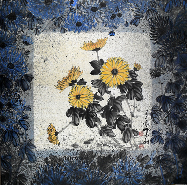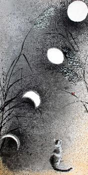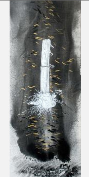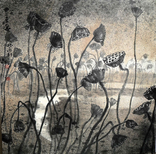「2005 浮萍物語-紅浮萍」、「2003 墨光躍種心祝福」二幅,都是前述心境的情感所投射表現出來。水墨材質的寬容性優於其他畫種,主要來自水性與墨的細分子,容易在中國宣紙上揮灑,宣紙材質多元,凡宣、棉、麻、皮等生熟特質軟硬兼備,便成為最有利的創作實驗素材。石雕的嘗試,雖然對於雕塑中泥塑翻模有過幾年的經驗,但是雕刻的部分就因工具與空間的限制下很難有機會學習,就石材、鐵材、銅材、木材等的練習一併探究,漸漸的有一些初啼的作品產生,立體創作對空間探討,也成為近作的實況。
