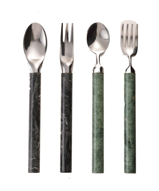 透過綠果創意國際的巧思,將花蓮特產大理石轉化為桌上的精緻餐具;取材自農村「而字耙」意象的叉子,搭配形似圓滿的典雅湯匙,將惜物哲學融入碧綠雋永的生活藝品。