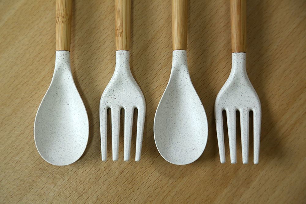 內含叉子、湯匙及筷子、餐具盒。通過FDA食品安全認證/EU歐盟食品安全認證/BPA認證許可,耐高溫120度,可於日常生活用。湯匙、叉子是稻稈纖維結合回收塑膠的材質製成,握把是竹子製成,兩者可拆開,方面收納或清洗。
