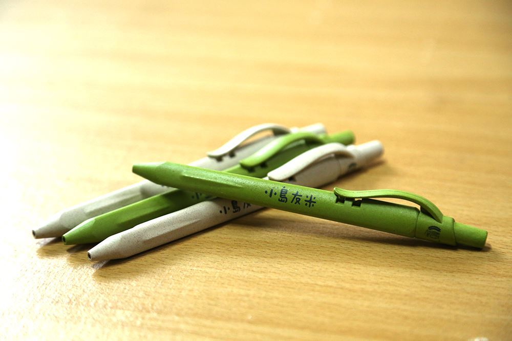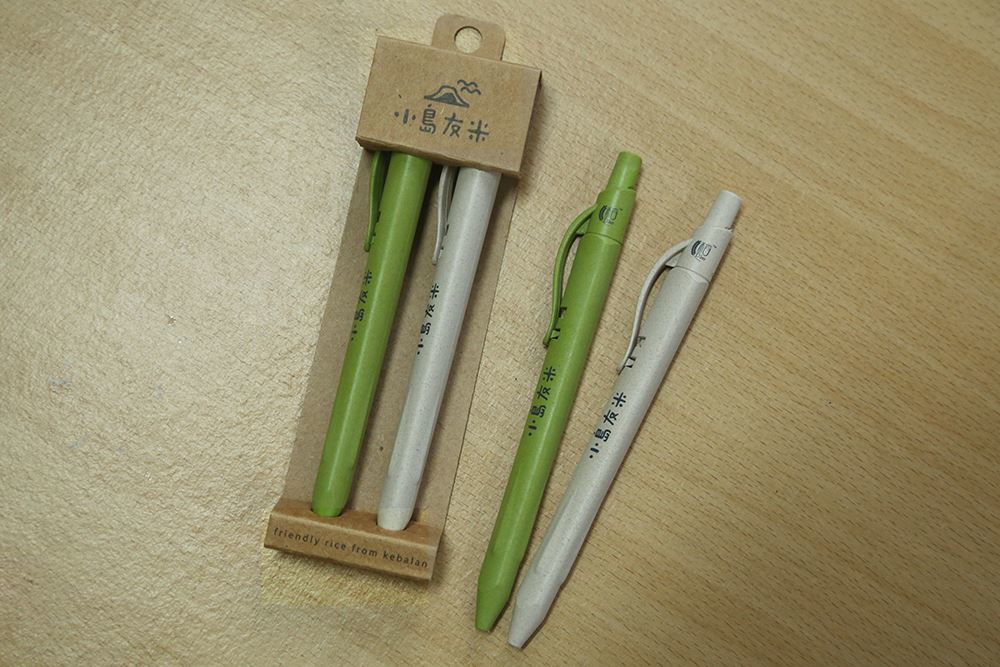 概念是降低塑膠的使用,將以往被視為空汙來源(燃燒稻草)及廢棄物的稻草再做利用。運用稻草的纖維結合回收塑膠再製而成,筆身的油墨是大豆油墨,符合國際規格的環保檢測,請安心使用。環保到底!可換筆芯喔!