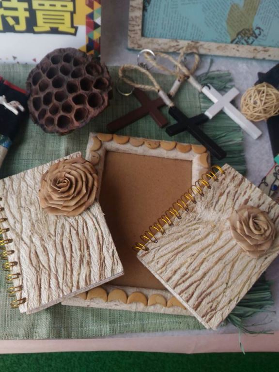 樹皮創作燈具、小家飾、筆記本、筆筒、面紙盒