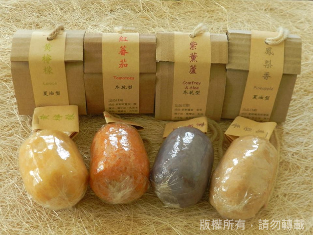 紅番茄皂、金盞蘿皂、黃檸檬皂、綠絲瓜皂、西瓜冰皂、紫薰蘆皂、鳳梨香皂、冬瓜皂。