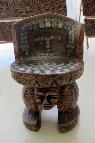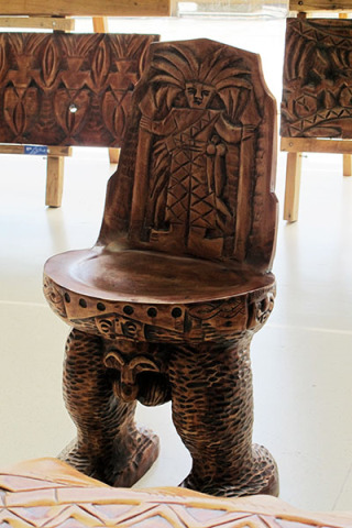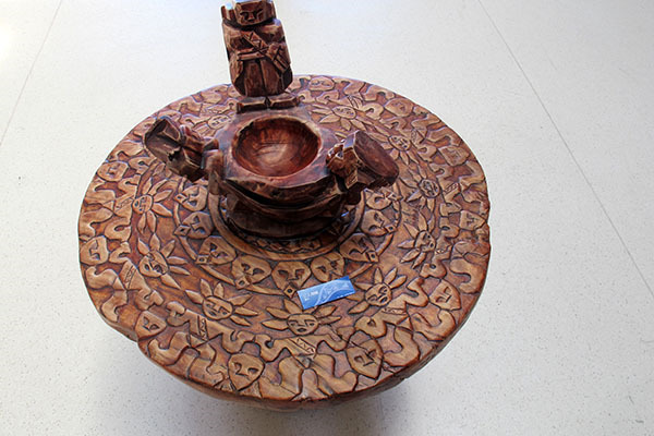 仔細觀察蔡老師的木雕作品,處處充滿驚奇的想像力,例如使用廢棄的牛車輪浮雕出豐年舞的場面,再將之改造成創意屏風;用漢鼓,圍繞鼓身浮雕出壯闊的樂舞場面;甚至將各類舞動的圖騰雕刻在燈罩、桌椅、珠寶盒、果盒的外觀上,兼具趣味性、生動性與生活的實用性。延伸至圓雕作品,頭目、勇士、獵人、求婚、捕魚、吹笛、百步蛇等,任何題目都能激發他的創作靈感,從平面到立體,從浮雕、圓雕至創意家具,蔡老師虔心沉浸在無框界、無設限的木雕創作世界中。長年於花蓮音樂界教學,作育英才無數,因此創作空檔也會持續進行歌謠教學。