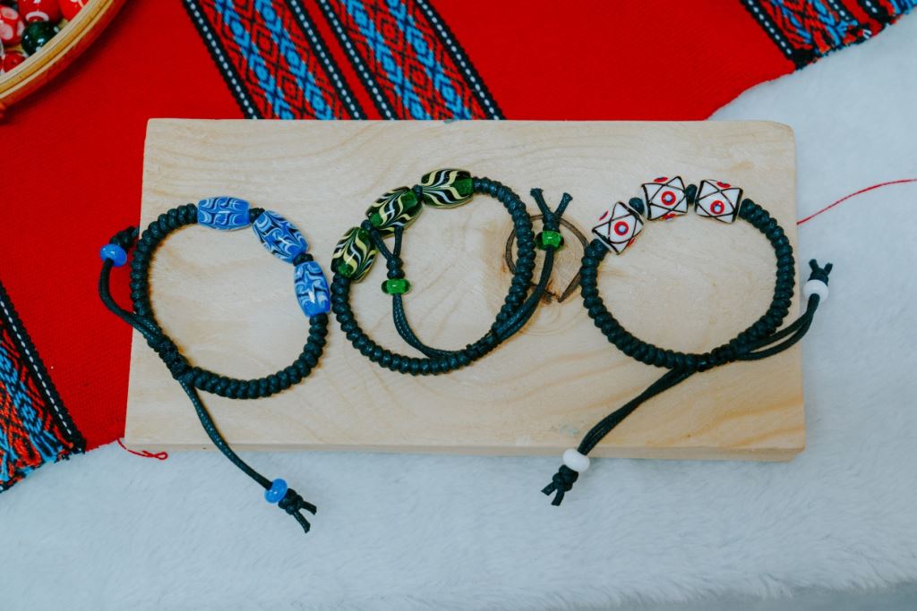 以捲覆技法燒製琉璃珠2-3顆,選定圖騰琉璃珠進行手環編串。一顆顆珠圓玉潤的作品,不僅僅是賞心悅目的工藝,也是生命故事的果子。